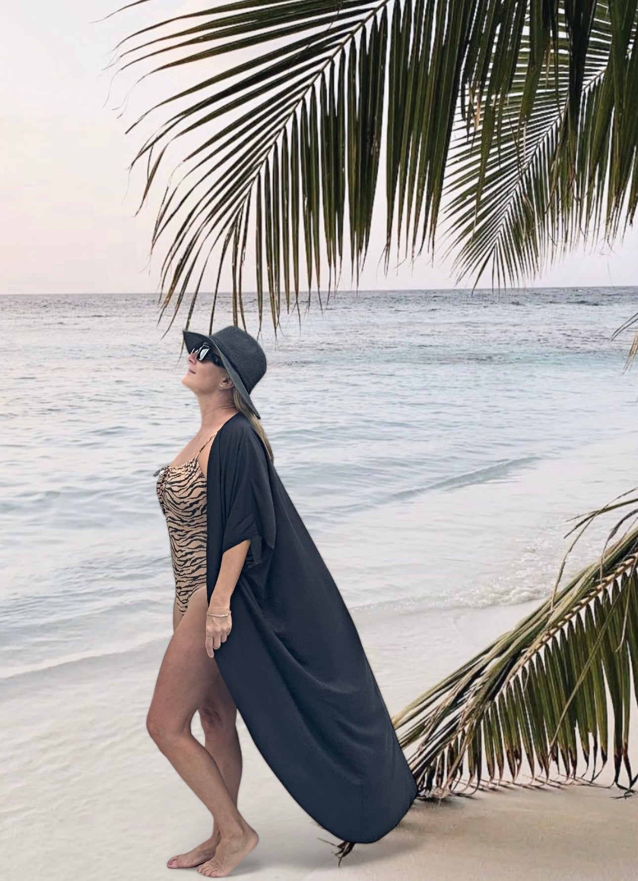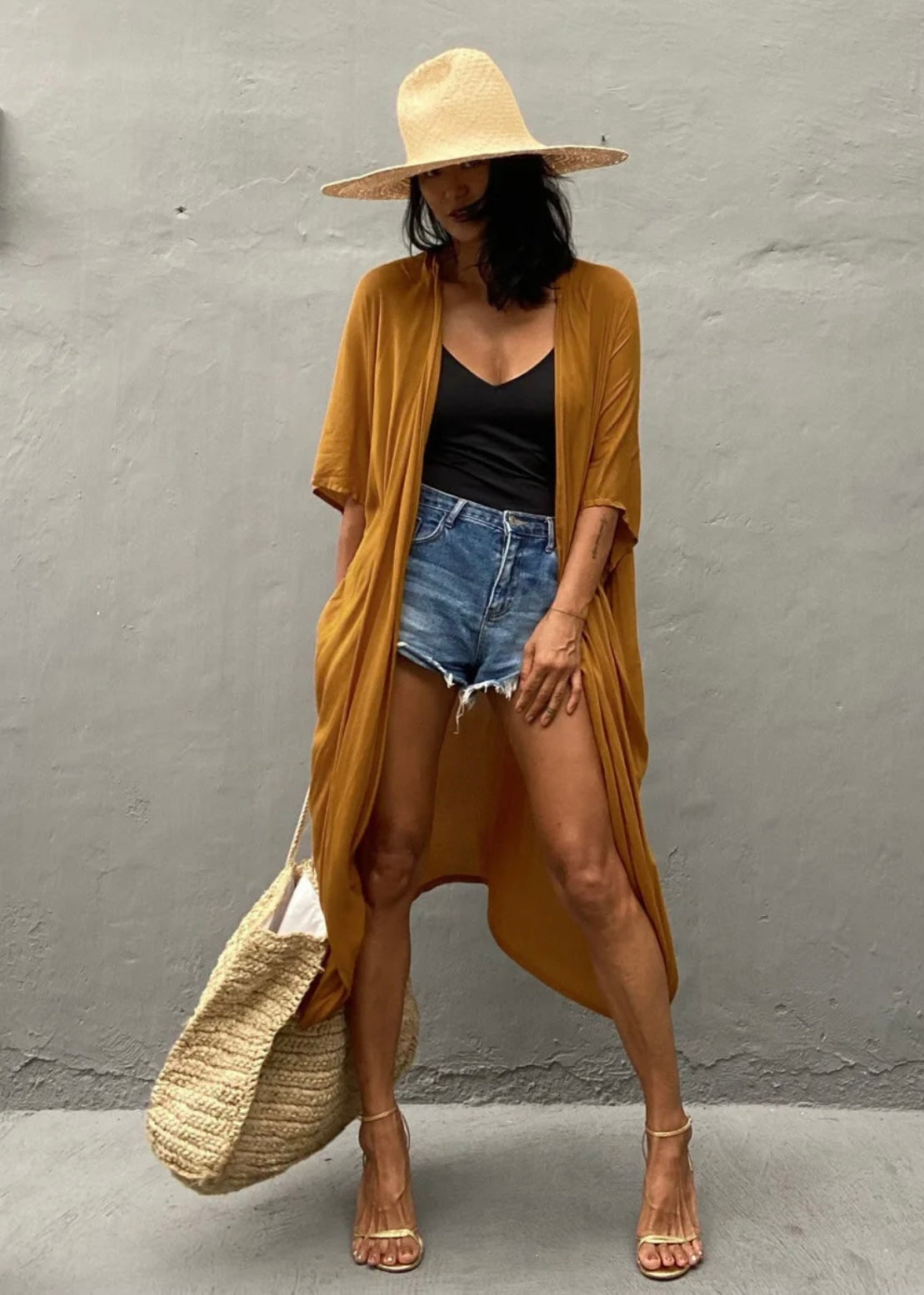 As the sun sets, the Jayde Kimono effortlessly transforms into a graceful evening dress. Its versatile design allows you to cinch the waist and create a more fitted silhouette, making it an ideal choice for a dinner date, a seaside soiree, or any special occasion.